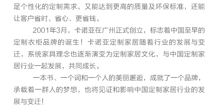 卡諾亞創(chuàng)立于2001年,是集研發(fā)、設(shè)計、生產(chǎn)和服務(wù)于一體的高新技術(shù)企業(yè)。旗下?lián)碛芯幽Х秸b、卡諾亞高端定制、羅亞全屋定制三大品牌。