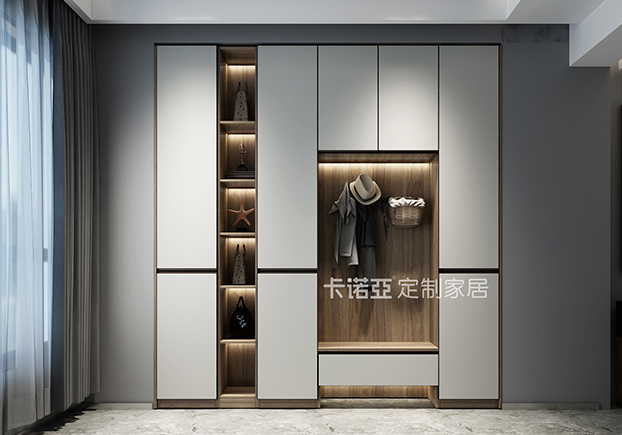 嵌入式玄關柜,下面是用木質(zhì)板做成的換鞋凳,上面再設計掛鉤,這樣實用功能和裝飾作用都大大增強。