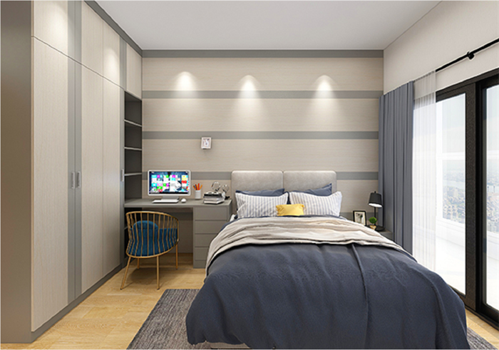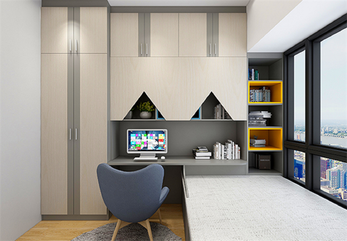 臥室有一個(gè)超大肚量的衣柜,高度直接到頂,寬度占據(jù)一整面墻,衣柜+書(shū)桌書(shū)柜一體設(shè)計(jì),收納衣物、寫(xiě)字看書(shū)學(xué)習(xí)都有了。