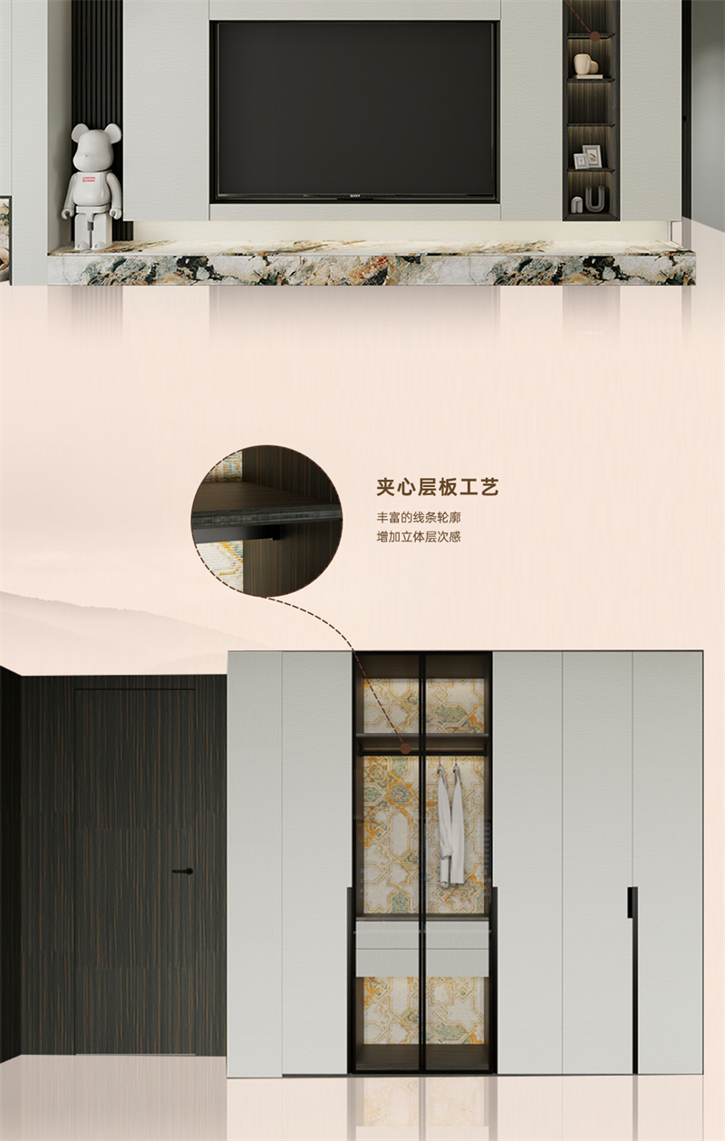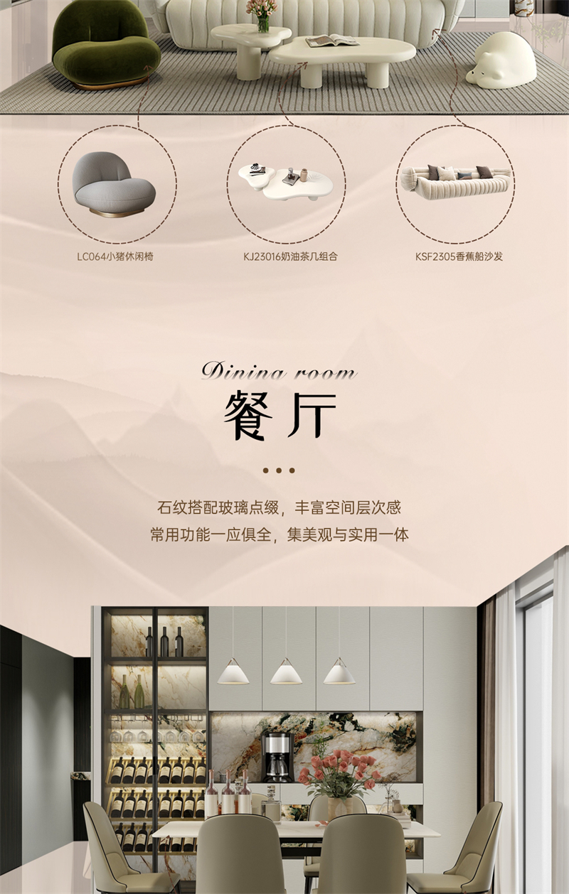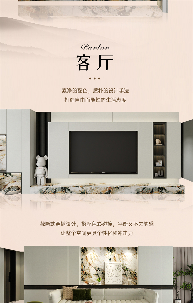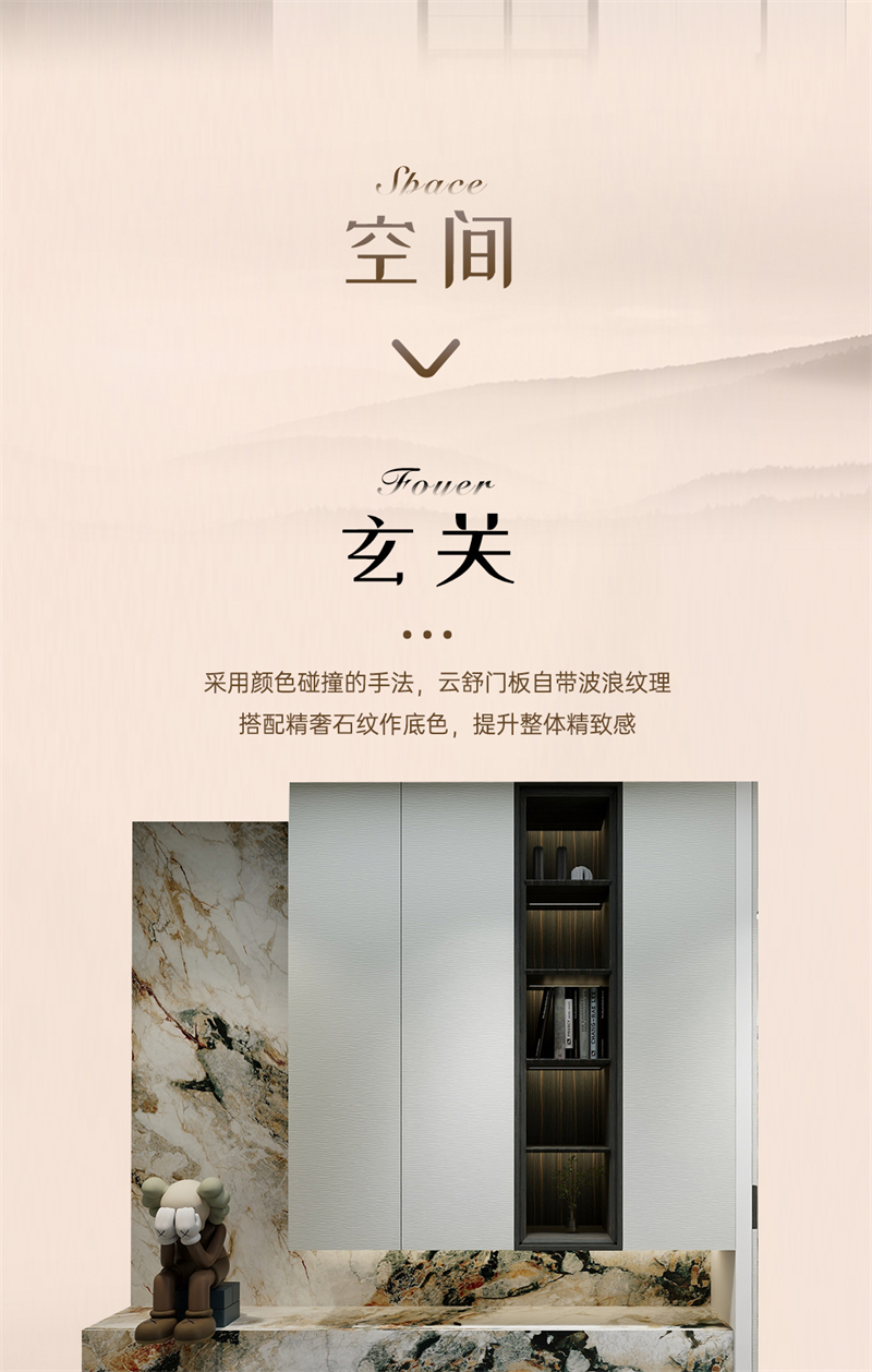 借助云水紋的元素,通過流動(dòng)的線條,波動(dòng)的紋理和現(xiàn)代的設(shè)計(jì)手法,打造舒適、放松、愉悅的家居氛圍。