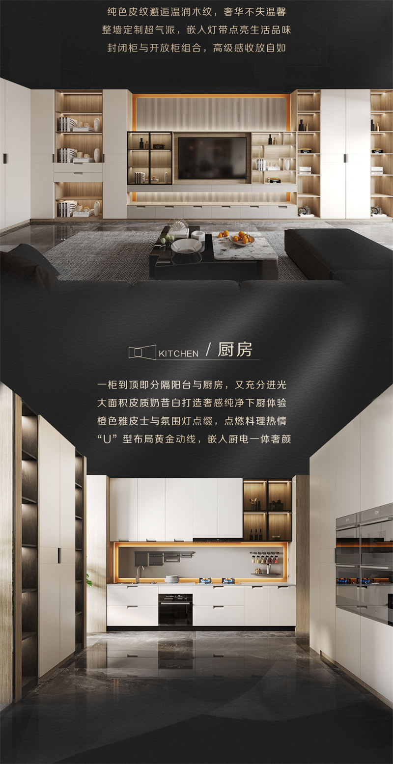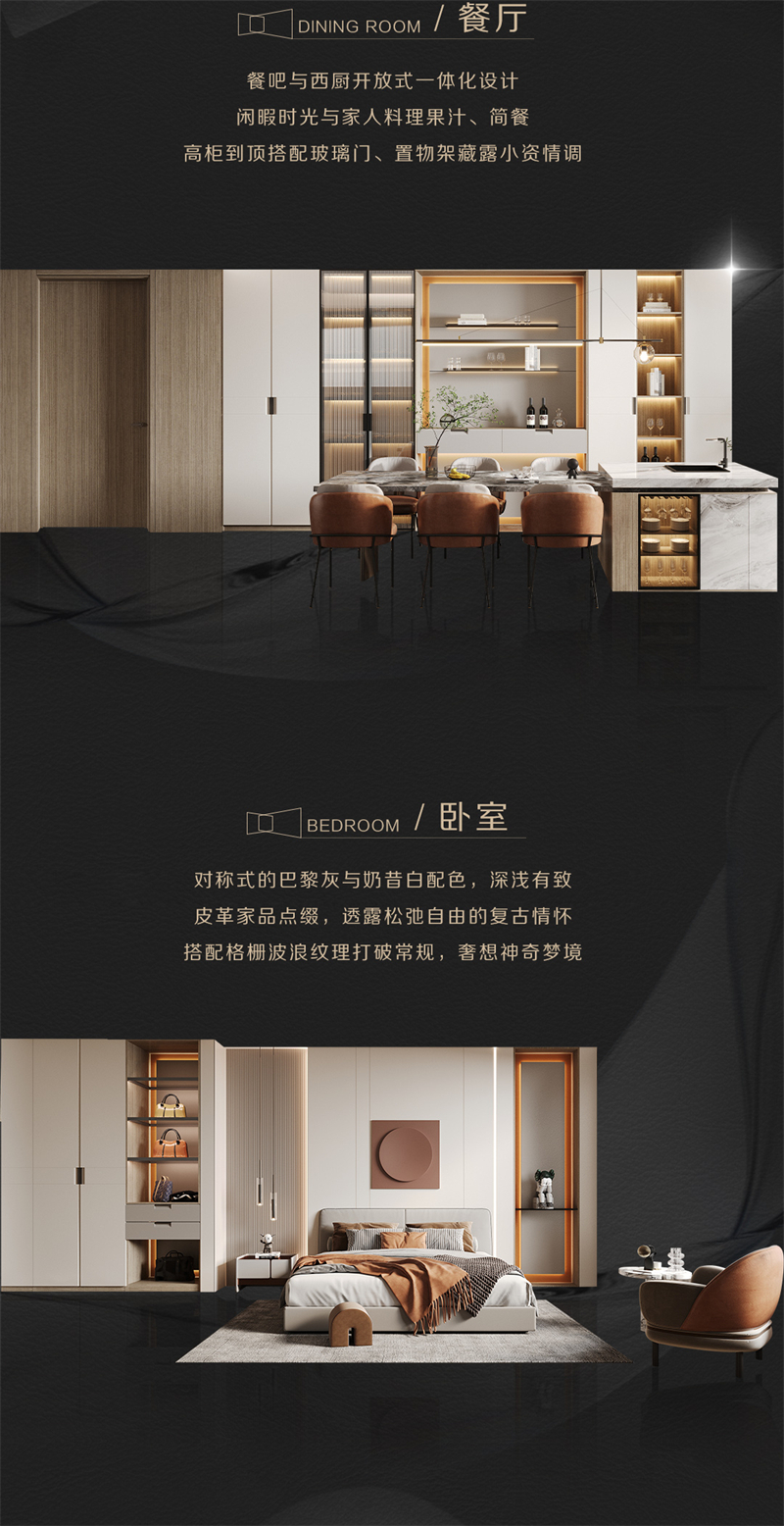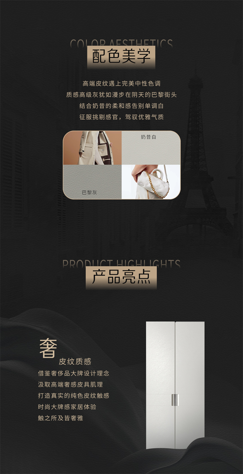 靈感來(lái)源于皮具奢侈品Hermes和LV 提取“H’元素勾勒門(mén)板簡(jiǎn)潔腰線(xiàn) 結(jié)合'V'元素塑造門(mén)縫立體造型 采用高端皮質(zhì)肌理打造極簡(jiǎn)造型門(mén)板 簡(jiǎn)奢有度優(yōu)雅有品的生活拉開(kāi)帷幕