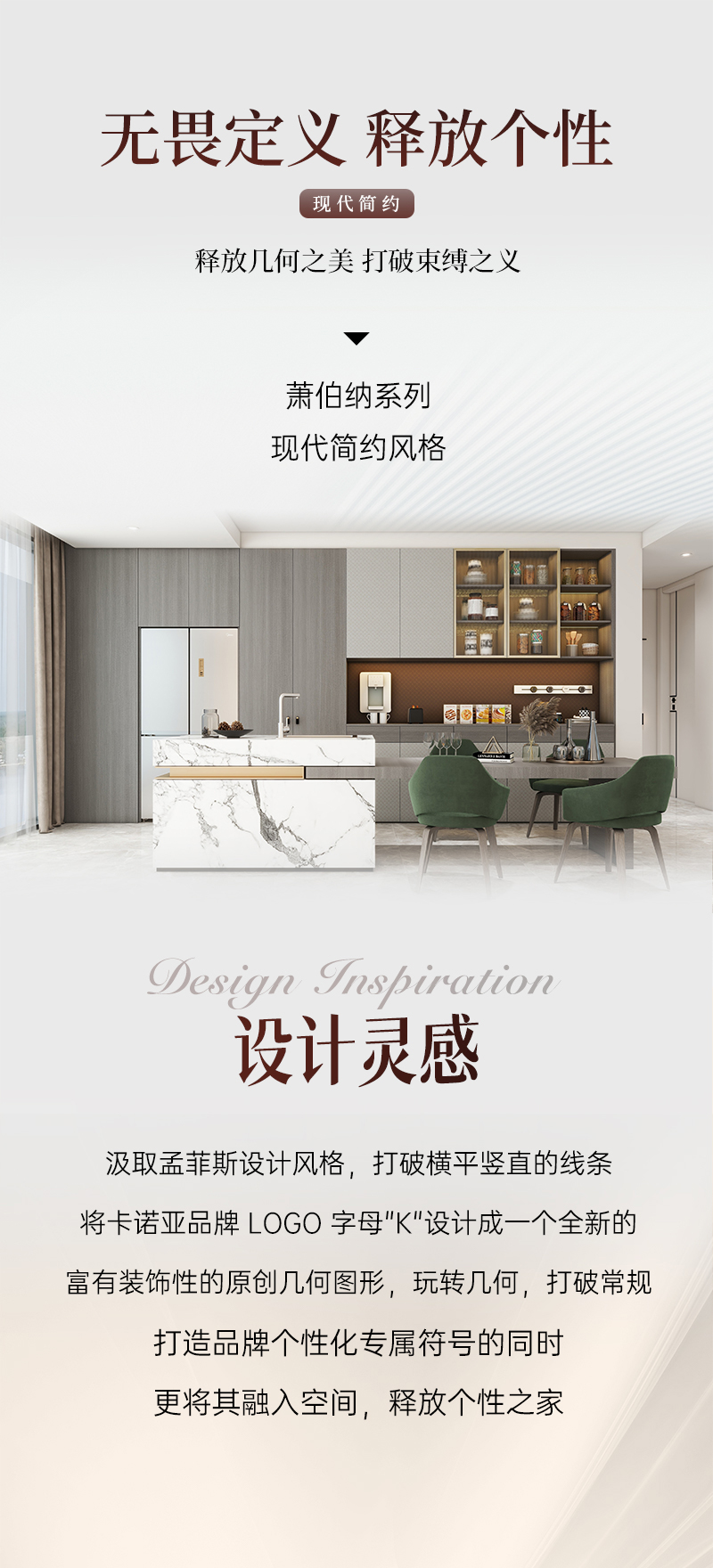 蕭伯納系列 | 現(xiàn)代簡約風(fēng)格汲取孟菲斯設(shè)計風(fēng)格,打破橫平豎直的線條,將卡諾亞品牌 LOGO 字母"K"設(shè)計成一個全新的富有裝飾性的原創(chuàng)幾何圖形,玩轉(zhuǎn)幾何,打破常規(guī),打造品牌個性化專屬符號的同時,更將其融入空間,釋放個性之家。