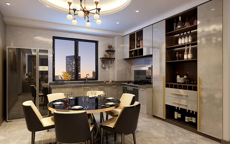 眾星羅列夜明深-寒山星夜——輕奢金屬感全屋定制,以夜的深沉為基調(diào),大氣、深邃,整體主色調(diào)為深色;以星的閃耀為裝點(diǎn),獨(dú)特、奢華,配色用于鮮亮的橘色調(diào)、玫瑰金屬線條。