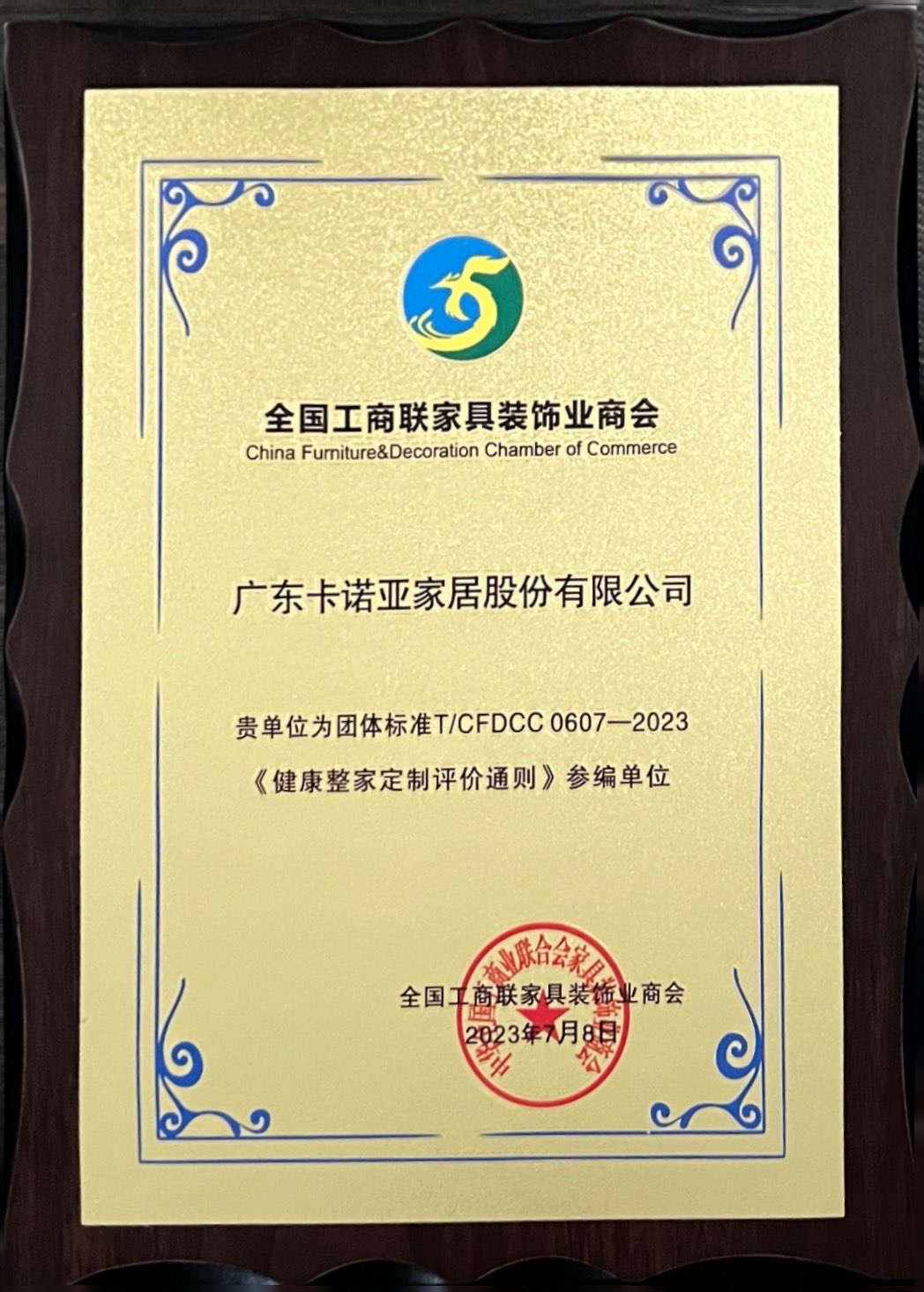 截止目前,卡諾亞成為10大國家及團(tuán)隊(duì)標(biāo)準(zhǔn)參編單位或起草單位,包括團(tuán)體標(biāo)準(zhǔn)T/CFDCC 0607-2023《健康整家定制評(píng)價(jià)通則》、GB/T41650-2022《家具 床 穩(wěn)定性、強(qiáng)度和耐久性測(cè)試方法》、T/CFDCCO212-2021《家居產(chǎn)品質(zhì)量評(píng)價(jià)準(zhǔn)則》、T/GCHA1.1-2018《定制家居產(chǎn)品 人造板定制衣柜》、T/CFDCC 0207-2019《定制家居產(chǎn)品安裝服務(wù)規(guī)范》等;作為無醛添加板材使用先行者,卡諾亞先后通過中國環(huán)境標(biāo)志認(rèn)證、美國EPA-NAF無醛豁免認(rèn)證、美國CARB-NAF無醛豁免認(rèn)證、日本F★★★★環(huán)保認(rèn)證、瑞士SGS環(huán)保認(rèn)證等權(quán)威榮譽(yù),致力為廣大消費(fèi)者打造一個(gè)環(huán)保、健康、綠色的家居生活空間。