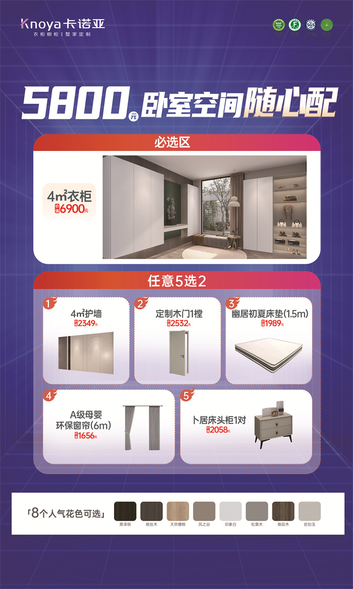 臥室空間隨心配5800元套餐,必選4㎡定制衣柜,8個(gè)時(shí)尚花色可選,分別是黑澤明、棕絲木、天然櫻桃、風(fēng)之谷、印象白、松栗木、御品木、巖如玉。套餐中可以自由選擇的產(chǎn)品包括4m護(hù)墻、1樘定制木門、1.5m護(hù)脊床墊、6米A級母嬰環(huán)保窗簾、1對床頭柜(5選2),一個(gè)套餐僅需5千多元,就能將柜、墻、門等產(chǎn)品一站配齊,真正實(shí)現(xiàn)“一家搞定,一價(jià)配齊,一體設(shè)計(jì)”。