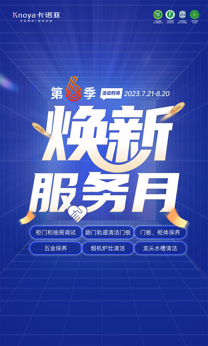 本次煥新服務(wù)月,不但有感恩回饋新老客戶專享煥新服務(wù)活動的各項(xiàng)鉅惠,同時(shí)針對老客戶,除了常規(guī)的上門維護(hù)保養(yǎng)服務(wù)之外,如果老客戶家里需要煥新,包括五金升級更換、配套家品更新、衣柜護(hù)墻更換等,還有推薦新客戶,均可獨(dú)享3大煥新專屬優(yōu)惠活動和各種福利。
