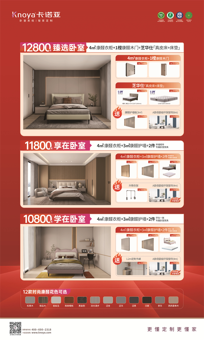 五一大促,卡諾亞力推12800元臻選臥室套餐,以及針對(duì)幸福老年的11800元享在臥室套餐、學(xué)生一族的10800元學(xué)在臥室套餐,不僅實(shí)現(xiàn)消費(fèi)者一站式購(gòu)齊,還為其帶來(lái)更多的便利和千人千面的個(gè)性化解決方案。3大套餐均包含4㎡康醛衣柜,可選十余款時(shí)尚個(gè)性的飾面花色,還有3㎡康醛護(hù)墻板、1樘康醛木門、2件專屬臥室家具、芝華仕大牌真皮床+床墊,驚喜獲贈(zèng)6米或4米A類母嬰級(jí)環(huán)保窗簾、1.2米定制書桌、升降衣架等,套餐明細(xì)請(qǐng)親臨門店咨詢。卡諾亞精心設(shè)計(jì)的臥室套餐,可確保與整體家居布局的協(xié)調(diào)與統(tǒng)一,全面提升臥室氣質(zhì),滿足不同消費(fèi)者的進(jìn)階居住體驗(yàn)和對(duì)品質(zhì)美好生活的追求。