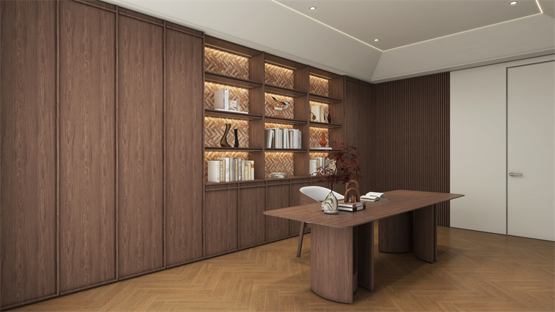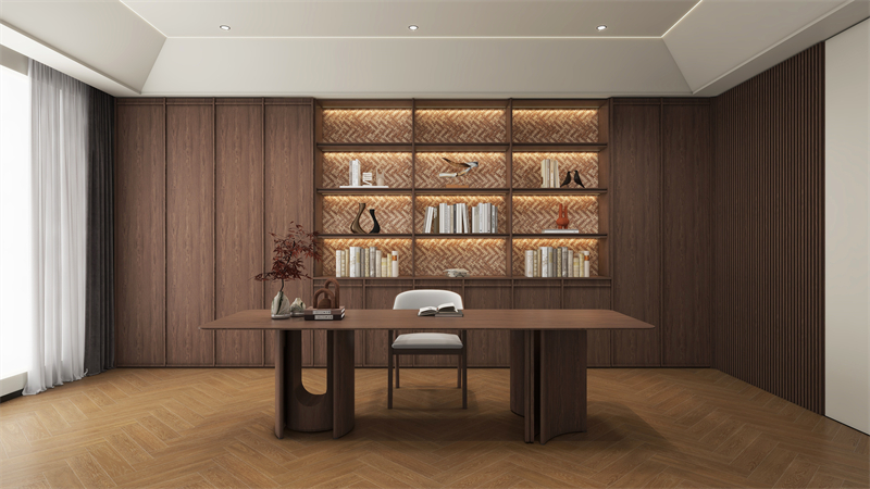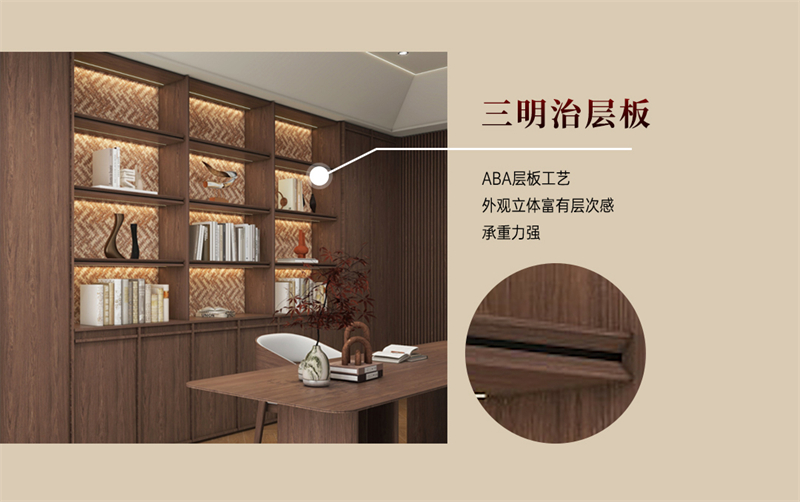 書(shū)柜采用三明治層板,外觀立體,富有視覺(jué)層次感且承重力強(qiáng)。木紋擁有歲月和自然的痕跡,為空間增添懷舊感,讓書(shū)房散發(fā)獨(dú)特的氣質(zhì)。
