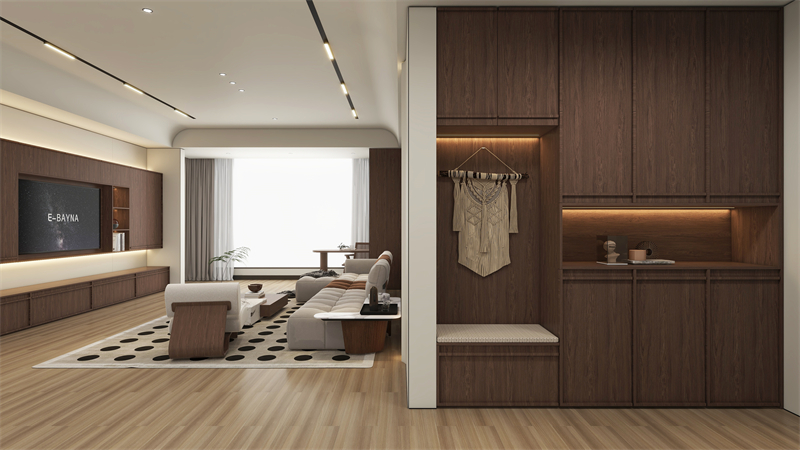 清秋胡桃與骨骼線(xiàn)搭配設(shè)計(jì),從入戶(hù)起就開(kāi)始鋪墊復(fù)古的基調(diào)。中間鏤空、換鞋凳的設(shè)計(jì),讓鞋柜實(shí)用性與裝飾性兼?zhèn)洌_(kāi)放區(qū)集掛、坐、置三重功能于一體。