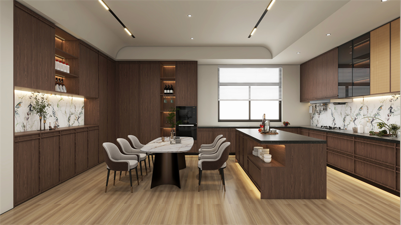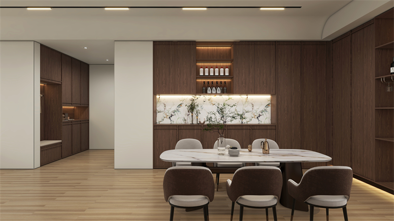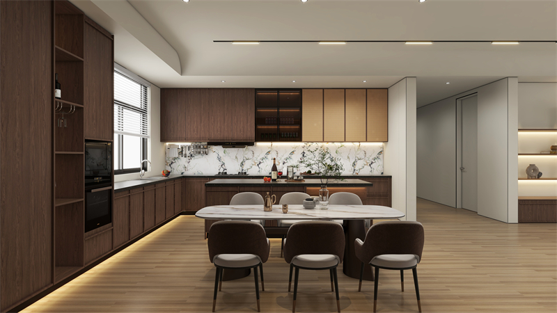 餐邊柜和櫥柜一體化設(shè)計(jì),石紋背板嵌入,更顯高級(jí)感,同色同奢定制,弱化了餐廳與廚房過(guò)渡的生硬感。
