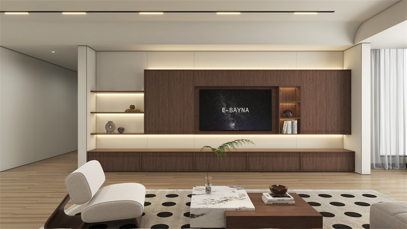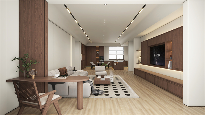 滿(mǎn)墻電視柜+懸空設(shè)計(jì),將收納做到隱形的同時(shí),也展現(xiàn)出了中古風(fēng)的輕盈溫馨,復(fù)古色胡桃木的加入,讓中古氣息越發(fā)濃郁。