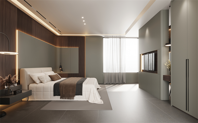 【睡眠區(qū)】床頭護(hù)墻板,一前一后采用溫暖的深木色搭配溫婉的“薄暮灰”,護(hù)墻板轉(zhuǎn)角采用圓弧過渡,優(yōu)雅流暢的曲線輪廓,彰顯空間的圓潤感、高級(jí)感和立體感。柔軟舒適的寢具,讓每個(gè)追夢人沉浸美夢之中。