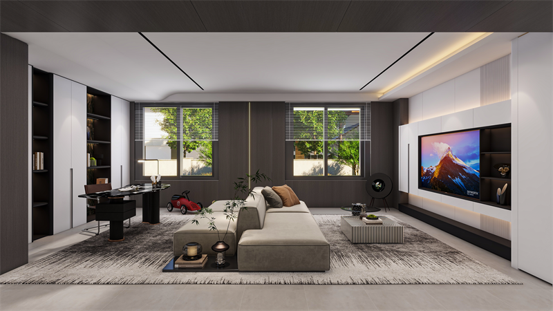 滿足年輕人向往的“去客廳化”設(shè)計(jì),打破固有的裝修模式,以居住者的生活方式為起點(diǎn),崇尚舒適至上。利用兩邊都可以坐的沙發(fā)做為隔斷,背后設(shè)計(jì)一個(gè)開放式書房。沙發(fā)背后放置書桌,讓人感覺安穩(wěn)踏實(shí),讓空間的分區(qū)更明顯。