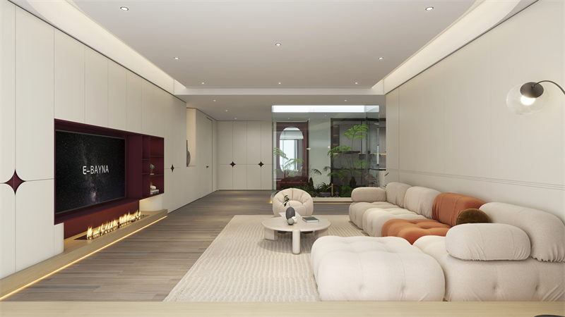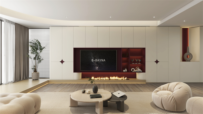 懸空電視柜撞色設(shè)計(jì),搭配弧狀拼接護(hù)墻板,保留奶油風(fēng)溫馨基調(diào)又增添幾分和諧且富有層次感的視覺效果,讓空間輕盈靈動(dòng)。