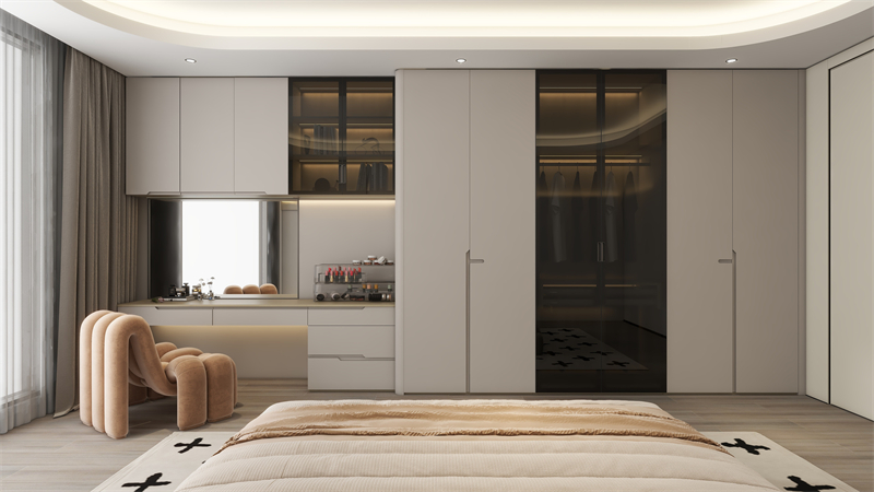 一門到頂衣柜,嵌入式梳妝臺(tái)一體化設(shè)計(jì)更省空間,在滿足衣物收納的同時(shí),亦解決日常美妝、辦公學(xué)習(xí)的需求。