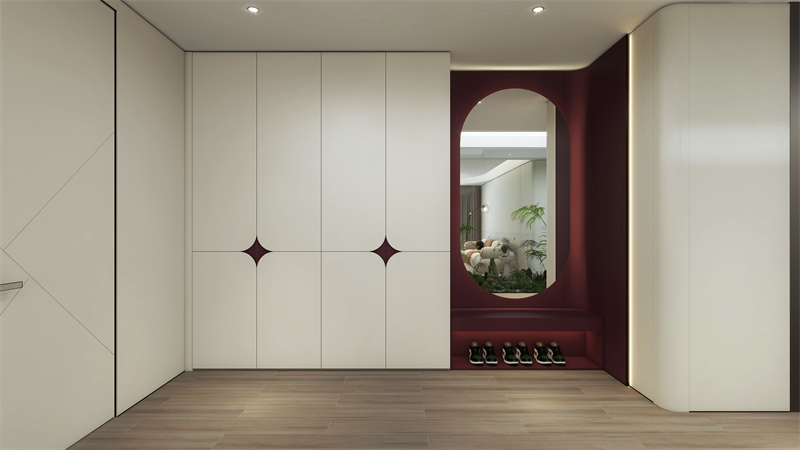 圓弧形的轉(zhuǎn)折處理,使得玄關(guān)區(qū)域在視覺上更加流暢與連貫,宛如自然延伸出的一個(gè)優(yōu)雅弧度,引領(lǐng)家人順暢步入家中。下方保留開放式常換鞋區(qū),簡(jiǎn)潔實(shí)用;圓弧拼接門型搭配“白芷”、“紅鸞”撞色點(diǎn)綴,打破傳統(tǒng)色彩界限,賦予空間柔和而深邃的視覺層次。