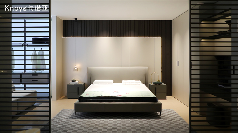 臥室空間,采用卡諾亞新品極簡風(fēng)格覽境系列,以柜墻門一體化設(shè)計搭配更多功能系統(tǒng),打造符合生活偏好與美學(xué)的“臥室系統(tǒng)”,汲取臥室系統(tǒng)“閑忙享樂學(xué)”生活方式靈感。