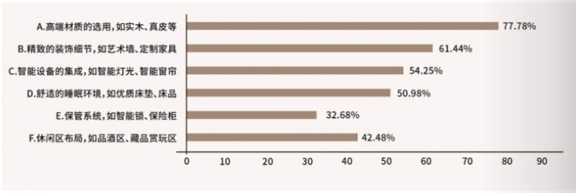 《中國臥室生活方式洞察報告》顯示,臥室生活占據(jù)人生至少三分之一的時間,其舒適度和功能性對提升生活質(zhì)量至關(guān)重要,不同人群對于臥室生活的需求是不一樣的。在打造高品質(zhì)臥室方面,高凈值人群尤其注重高端材質(zhì)的選用、精致的裝飾細(xì)節(jié)以及智能化設(shè)備的應(yīng)用。具體來看,77.78%的受訪者認(rèn)為高端材質(zhì)不可或缺,61.44%的人認(rèn)為精致細(xì)節(jié)同樣重要。