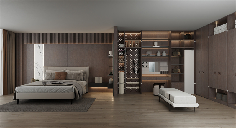 產(chǎn)品亮點:1.松韻、耀金、秋香木等溫潤色調(diào)巧妙組合,構(gòu)筑“雅而不寡” 的視覺基調(diào),營造溫馨高雅的空間氛圍。2.采用進口榆木木皮,呈現(xiàn)自然美觀的質(zhì)感,且具備環(huán)保健康、耐用性強、個性造型等優(yōu)點.3.金屬水性漆環(huán)保健康, 3底2面的涂裝工藝,裝飾空間質(zhì)感更高級。4.獨特斜向切割面與門型設(shè)計,搭配 25mm超導(dǎo)發(fā)光層板、宣紙發(fā)光板及ABA夾心工藝等,演繹“Less is more”的輕高定美學(xué),展現(xiàn)精致簡約的空間格調(diào)。