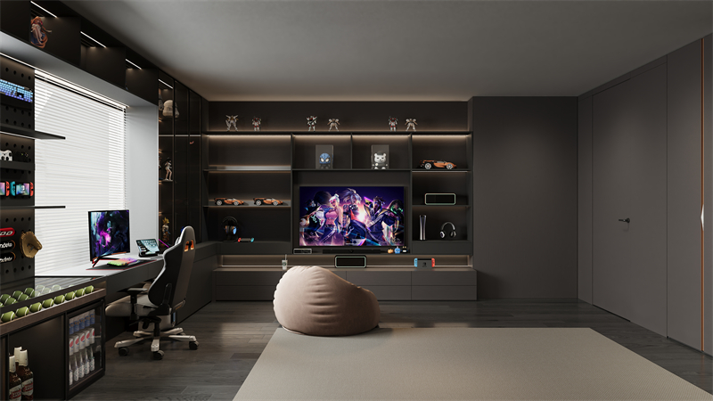 對(duì)于熱愛娛樂的活力青年,“樂在臥室” 設(shè)計(jì)融入了豐富的娛樂元素。配備了超大屏幕的電視或投影儀,打造私人家庭影院。競(jìng)技區(qū)則配備可升降的電競(jìng)桌椅,自適應(yīng)腰托和4D 扶手可以根據(jù)身體姿勢(shì)自動(dòng)調(diào)節(jié),緩解疲勞。此外,裝備補(bǔ)給站就在手邊,方便拿取手柄耳機(jī)等裝備,讓你在游戲中隨時(shí)保持最佳狀態(tài),讓臥室成為娛樂與休閑的雙重空間。