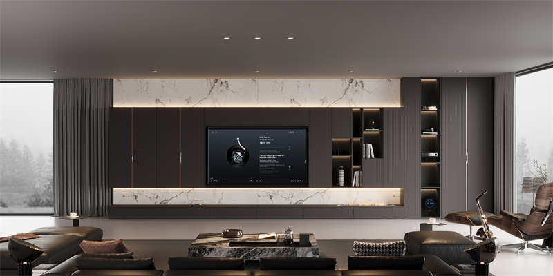 ·材質(zhì)對(duì)話:直紋肌理板材與澀黑柜體形成深淺對(duì)比,數(shù)碼打印出來(lái)的紋理如大理石般通透,鋁木玻璃柜將金屬堅(jiān)韌與木材溫潤(rùn)完美結(jié)合。