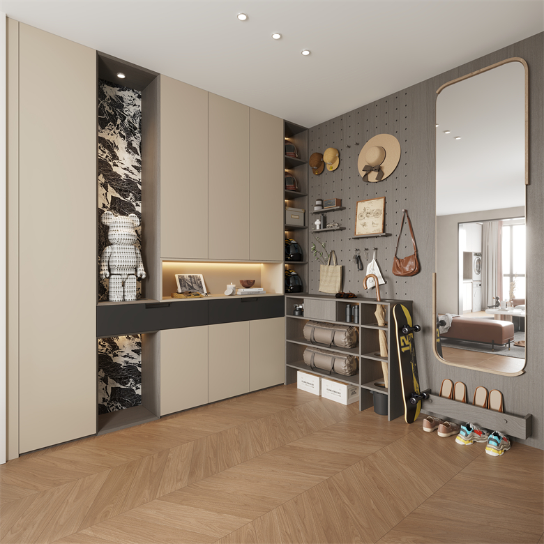 推開(kāi)家門(mén),迎面而來(lái)的是精心設(shè)計(jì)的玄關(guān)空間。這里不僅是收納功能區(qū)域,更是從喧囂都市回歸寧?kù)o生活的過(guò)渡地帶。趣逸系列玄關(guān)以穿插式設(shè)計(jì)手法打造立體視覺(jué)層次,創(chuàng)意洞洞板讓收納兼具功能性與藝術(shù)感。