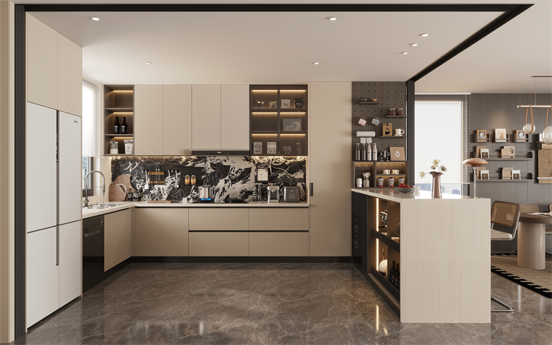 開(kāi)放式餐廚設(shè)計(jì)是趣逸系列的亮點(diǎn)之一。小吧臺(tái)的巧妙設(shè)置既可作為早餐角,也能變身為深夜小酌的浪漫空間。彌月UV膚感櫥柜門(mén)板防指紋易清潔,內(nèi)嵌式家電讓操作動(dòng)線(xiàn)流暢合理。這里既有現(xiàn)代廚房的利落,又保留著家的溫度。