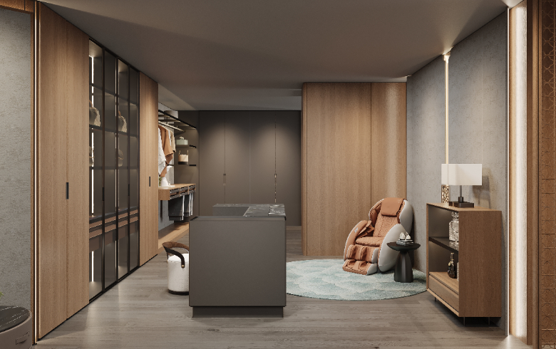 收納區(qū)則將衣帽間巧妙劃分為懸掛、疊放、展示與存儲區(qū)域,極致效能中蘊藏雅致,彰顯內(nèi)斂的高端生活質(zhì)感。
