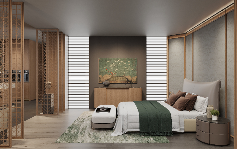 系列以儒雅中式為風(fēng)格基調(diào),融匯自然意象與人文情懷,通過材質(zhì)、色彩與光影的層層遞進,營造出靜謐幽深、富有詩意的居住氛圍。木紋如時光留痕,耀金漆面若星輝閃爍,宣紙發(fā)光板朦朧如月,每一處細節(jié)皆是對東方美學(xué)的現(xiàn)代詮釋。