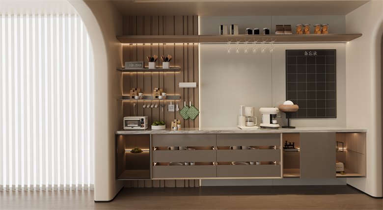 布局設(shè)計(jì)上,羅亞全屋定制更是打破了家居就該有固定模樣的陳規(guī)。餐廳與陽(yáng)臺(tái)不再是割裂的存在,而是被打造成聯(lián)動(dòng)的“咖啡區(qū) + 品酒區(qū)”;早晨在這里沖一杯手沖,用咖啡香喚醒元?dú)?;夜晚調(diào)一杯利口酒,讓微醺消解疲憊。