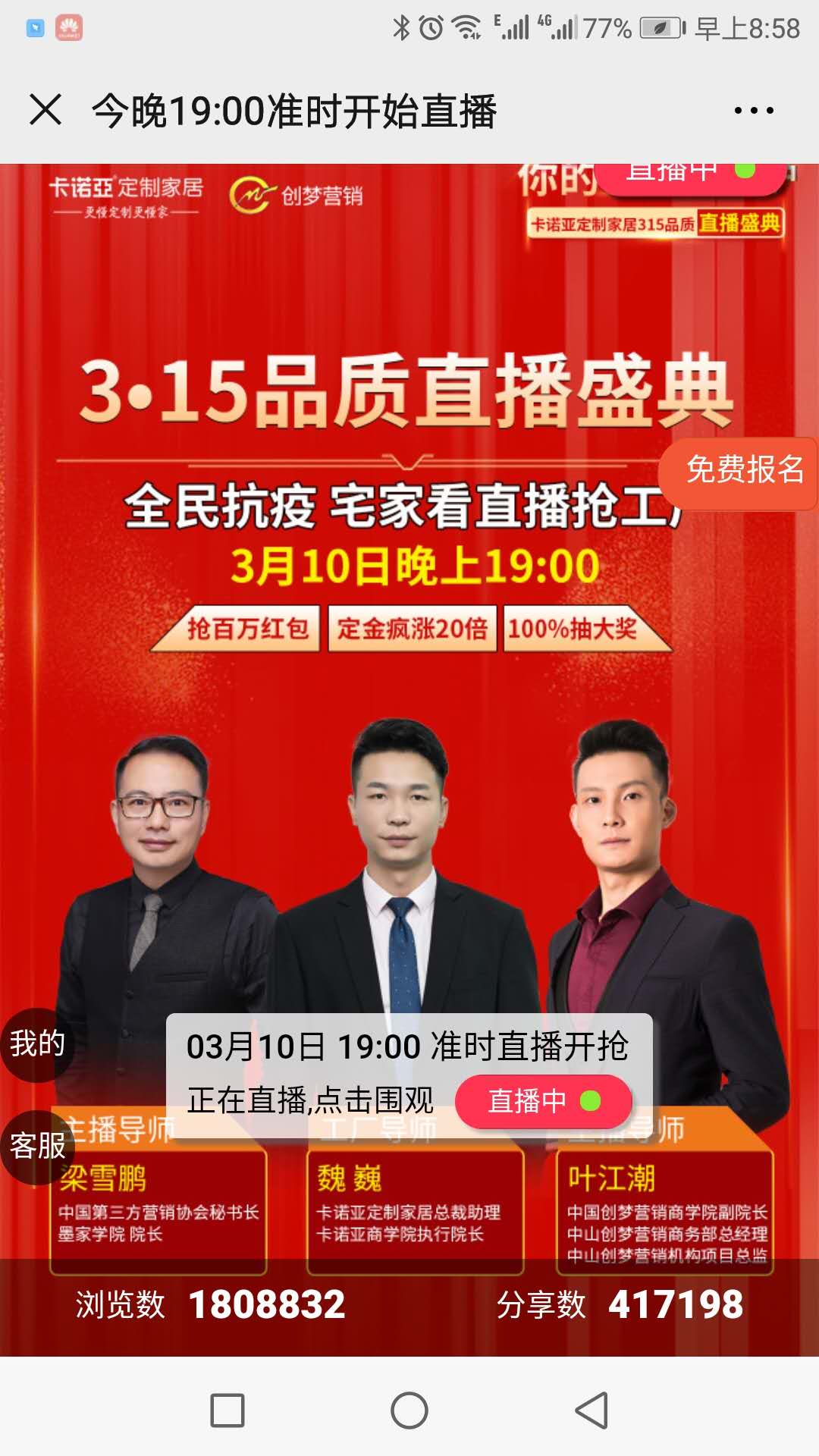 歲末年初,疫情的突襲讓直播成為各行各業(yè)的“香餑餑”。近一個(gè)月以來(lái),家具建材行業(yè)直播活動(dòng)連連刷屏,中國(guó)全屋定制十大品牌之一的卡諾亞,憑借專注定制家居19年的綜合實(shí)力,于2月27日-3月10日舉行“315品質(zhì)直播盛典”也實(shí)現(xiàn)了全網(wǎng)刷屏,活動(dòng)捷報(bào)頻傳,最終以180萬(wàn)+的瀏覽數(shù)、在線訂單8278單、銷(xiāo)售總額逾3億的業(yè)績(jī)完美收官??ㄖZ亞以2020年315國(guó)際消費(fèi)者權(quán)益日為引,憑匠心品質(zhì)&服務(wù)升級(jí)取勝,讓所有“宅”人士都能感受到家居生活的美好。
