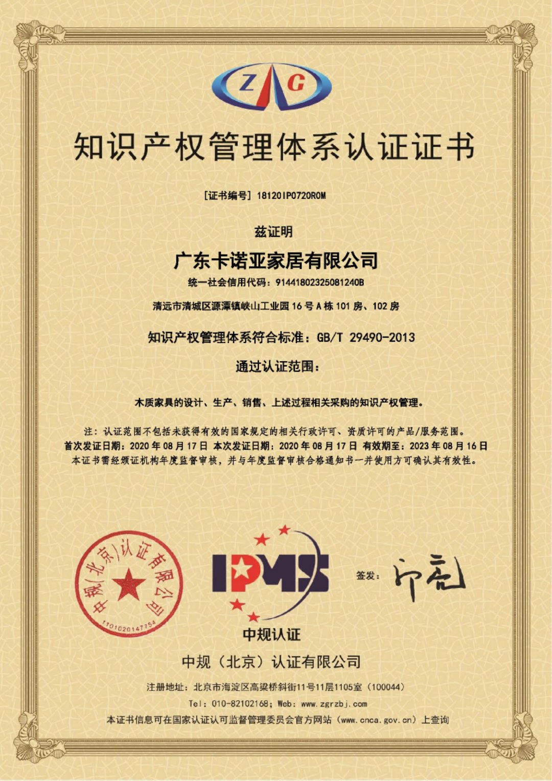近日,經(jīng)層層嚴(yán)格的內(nèi)審、外審,作為高新技術(shù)企業(yè)的卡諾亞,順利通過(guò)中規(guī)(北京)認(rèn)證有限公司的審核,其知識(shí)產(chǎn)權(quán)管理體系完全符合國(guó)家關(guān)于企業(yè)知識(shí)產(chǎn)權(quán)管理規(guī)范的要求。獲此認(rèn)證,表明卡諾亞在推進(jìn)公司知識(shí)產(chǎn)權(quán)管理規(guī)范化方面獲得重要認(rèn)可,綜合競(jìng)爭(zhēng)力進(jìn)一步提升,對(duì)企業(yè)健康可持續(xù)發(fā)展帶來(lái)深遠(yuǎn)影響,也為中國(guó)定制家居行業(yè)推進(jìn)知識(shí)產(chǎn)權(quán)管理體系建設(shè)樹(shù)立了標(biāo)桿。