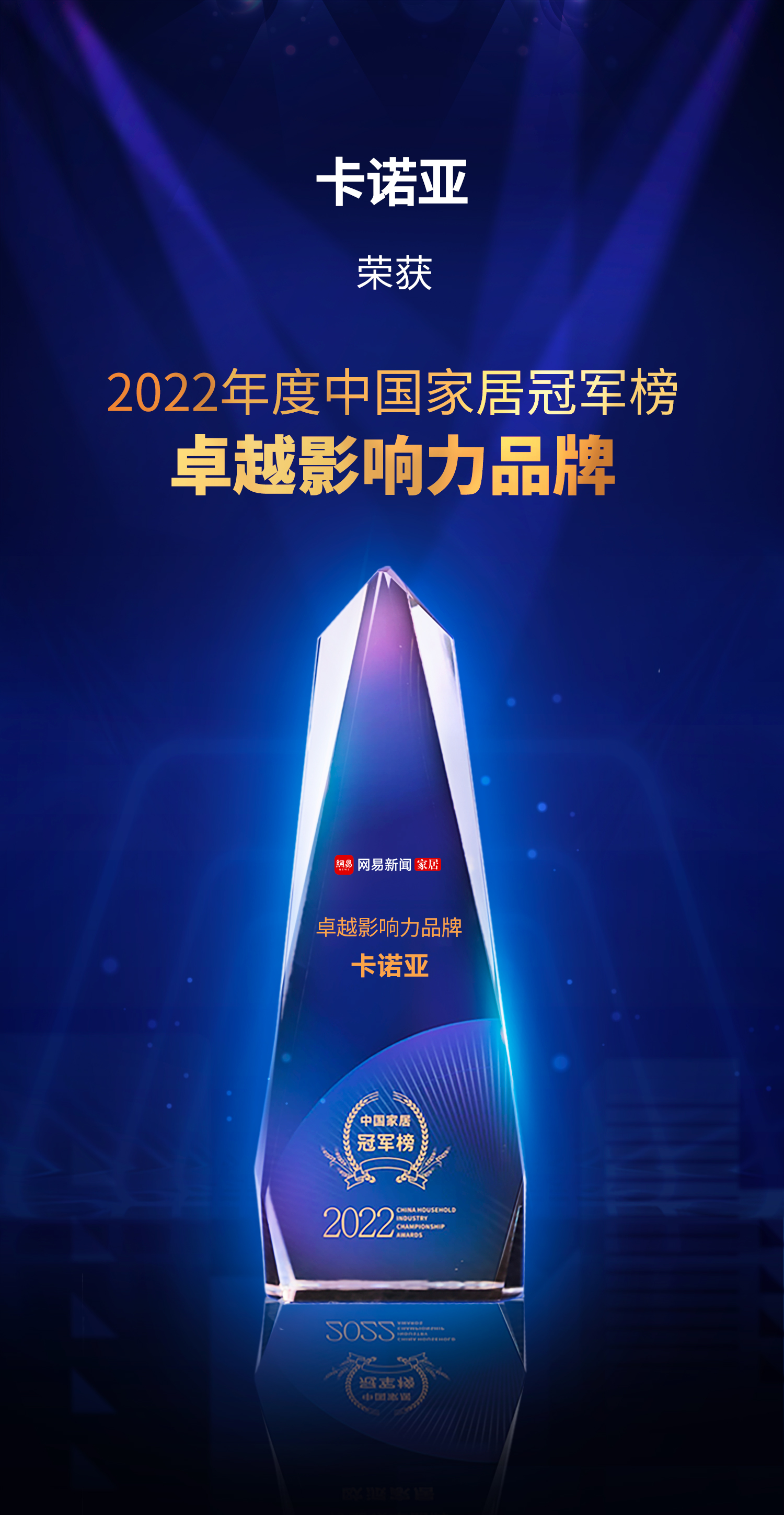 2022網(wǎng)易中國家居冠軍榜,旨在對本年度中國家居產(chǎn)業(yè)有著卓越成就和杰出貢獻的家居品牌和人物予以表彰,遴選行業(yè)有態(tài)度的實力榜樣,激發(fā)優(yōu)秀品牌和人物的引領(lǐng)作用,推動行業(yè)健康蓬勃發(fā)展。本次盛典發(fā)布2022年度中國家居冠軍榜“卓越影響力品牌”、“年度領(lǐng)軍人物”等十大重磅獎項,甄選行業(yè)優(yōu)秀標桿,見證行業(yè)冠軍能量。卡諾亞作為家居行業(yè)的佼佼者,眾望所歸獲得“卓越影響力品牌”、“年度領(lǐng)軍人物”雙獎,持續(xù)引領(lǐng)行業(yè)高質(zhì)量前行。